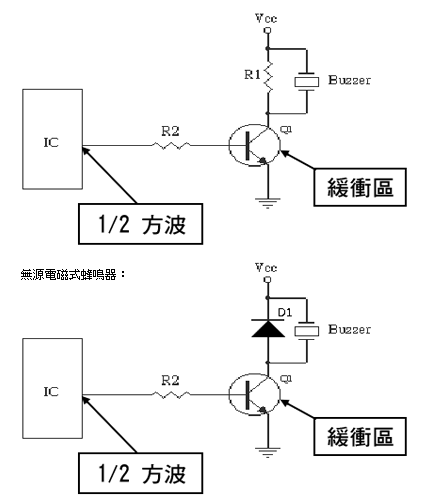 使用者若是使用無(wú)源壓電式蜂鳴器(External Drive)、無(wú)源壓電式蜂鳴器( Self Drive) 或是使用無(wú)源電磁式蜂鳴器,及使用有源壓電式蜂鳴器和有源電磁式蜂鳴器,建議使用下列的驅(qū)動(dòng)線路: